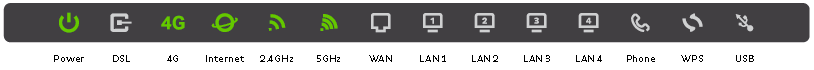 - Wait approximately 3 minutes for the modem’s Power, 4G, Internet and 2.4GHz/5GHz WiFi lights to turn on and settle.