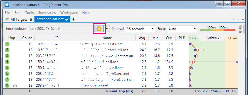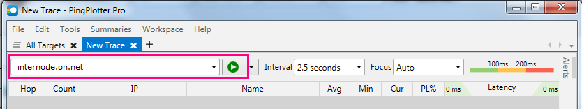 - Type internode.on.net or another address you wish to ping/traceroute into the address bar and hit the Start button to begin the test.